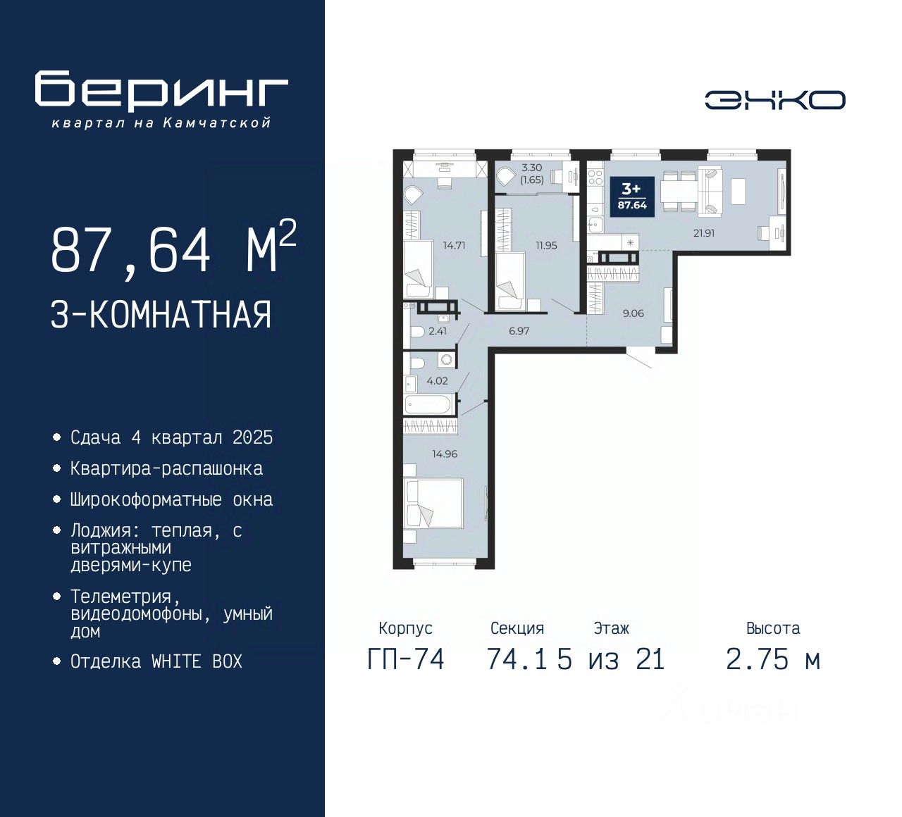 3-комн. квартира в ЖК "Беринг" на 5 этаже. Квартира без отделки, после выдачи ключей можно делать ремонт. Общая площадь: 87.64 кв.м., жилая: 41.62 кв.м., площадь просторной кухни-столовой: 21.91 кв.м. Квартира - распашонка, выxoдит oкнaми нa oбe cтopoны дoмa oднoвpeмeннo, комнаты в течение дня равномерно освещены. В квартире одна лоджия, один совмещенный и один раздельный санузел. Высота потолков 2.75 м.