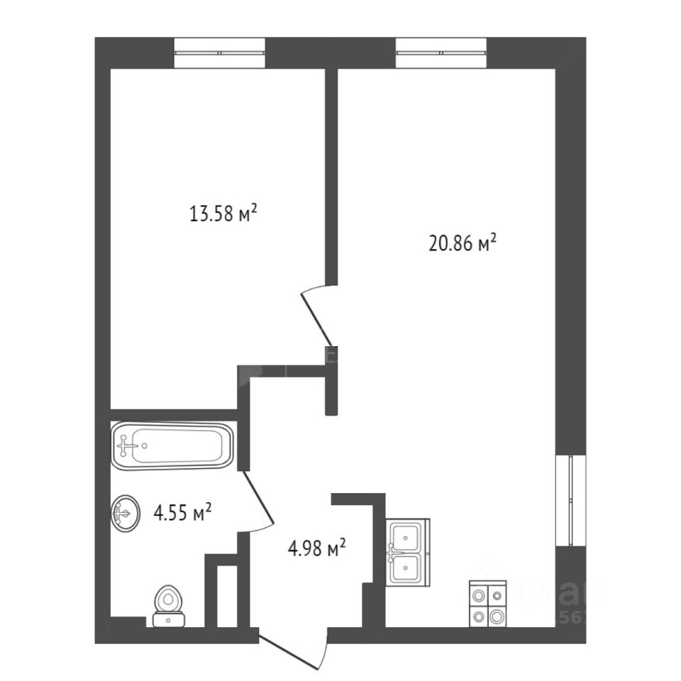 Общая площадь квартиры 44,5 м.кв. Спальня 13,58м.кв., кухня-гостиная 20,8м.кв.