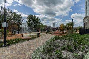 Безопасный двор для детей и взрослых: Закрытая территория с современными детскими и спортивными площадками, включая баскетбольную зону.