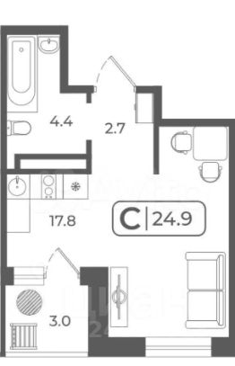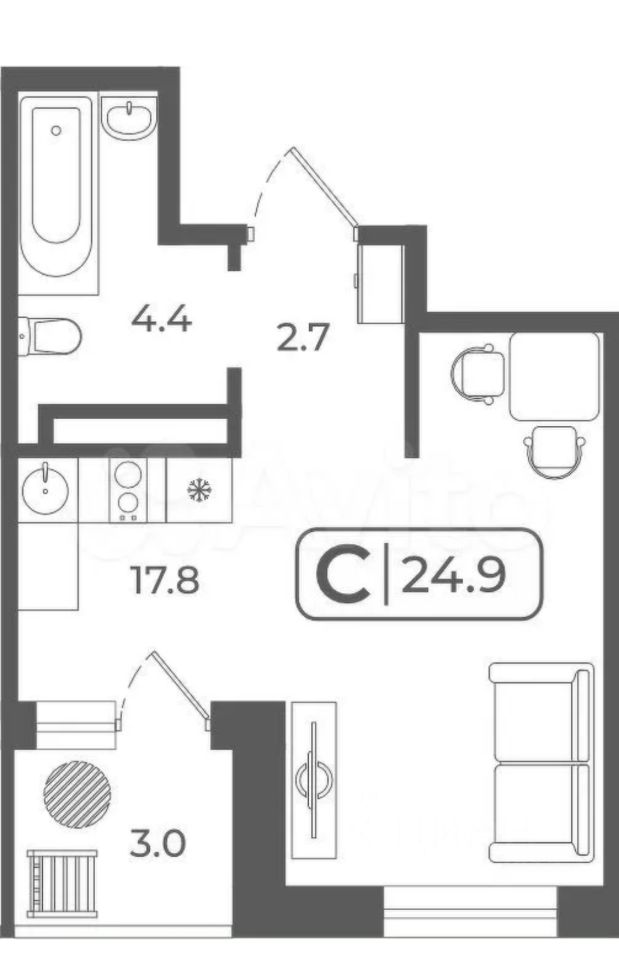 2. общая площадь 27,9м2 с удобной планировкой, с отдельными зонами под кухню, спальню, гардеробную, для занятий;