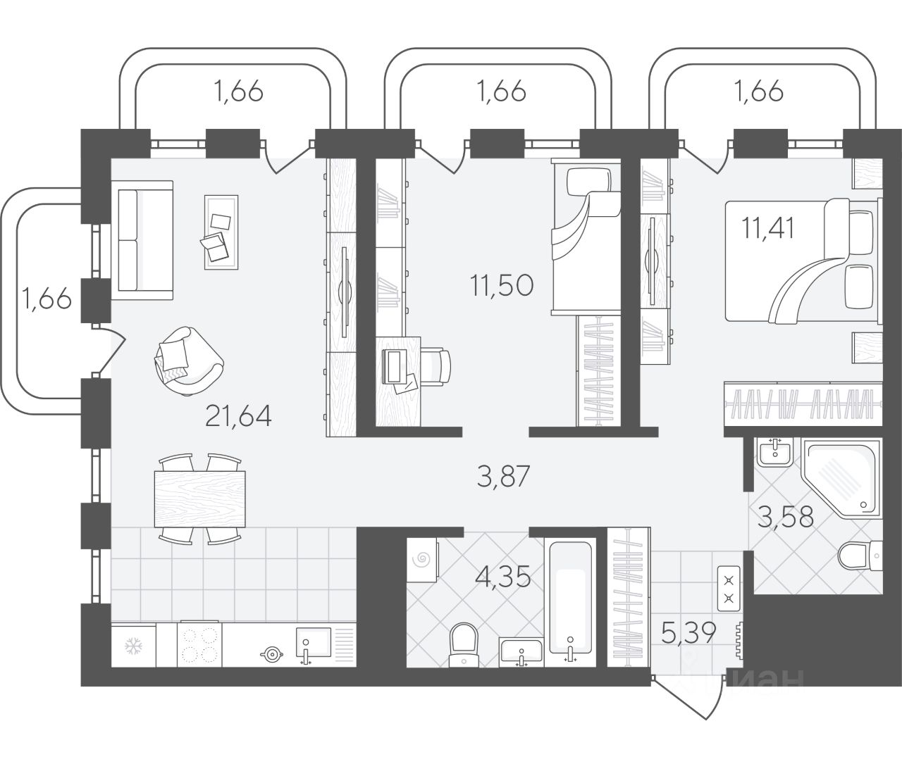 Квартира с 2 спальнями площадью 68,38 кв.м