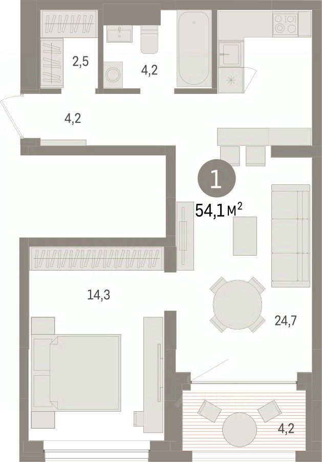 Квартира с кухней-гостиной и одной спальней в Доме у озера. Особенности планировки: гардеробная, лоджия, предчистовая отделка.