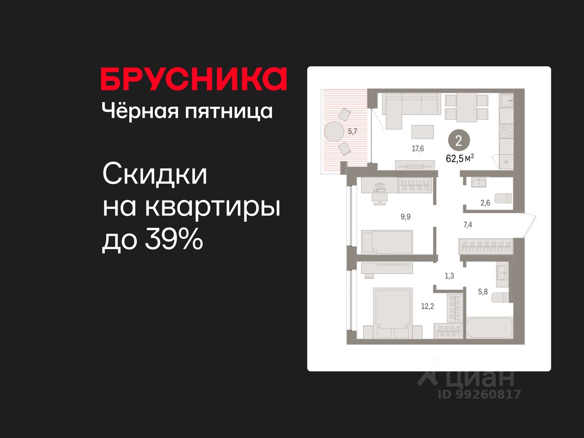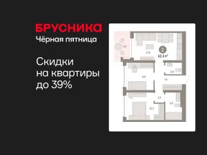 2-комн. квартира с предчистовой отделкой в ЖК "Дом у озера" на 7 этаже. Общая площадь: 62.52 кв.м. Высота потолков 2.7 м.