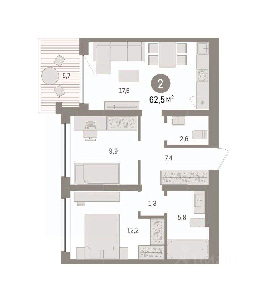 Квартира с кухней-гостиной и двумя спальнями в Доме у озера. Особенности планировки: второй санузел, разнесённые спальни, предчистовая отделка, балкон.