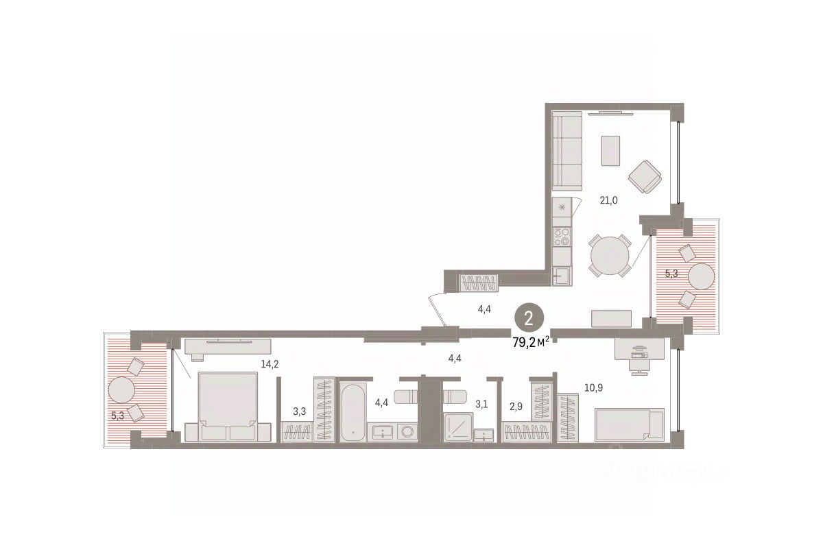 Квартира с кухней-гостиной и двумя спальнями в Доме у озера. Особенности планировки: гардеробная, вид во двор, разнесённые спальни, предчистовая отделка, мастер-спальня, балкон.