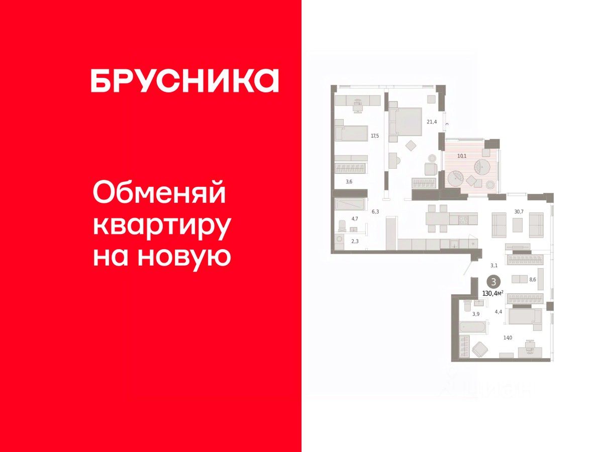 Квартира с кухней-гостиной и тремя спальнями в жилом районе "Зарека". Особенности планировки: разнесённые спальни, свободная планировка.