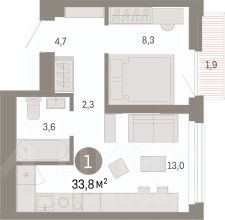 Однокомнатная квартира от застройщика с предчистовой отделкой в ЖК "Зарека" на 17 этаже. Общая площадь: 33.76 кв.м., жилая: 8.3 кв.м., площадь просторной кухни-гостиной: 13 кв.м. Все окна выходят на одну сторону. В квартире один балкон, один совмещенный санузел. Высота потолков 2.7 м.