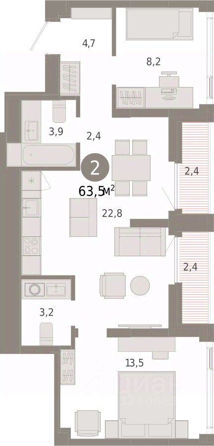 Квартира с кухней-гостиной и двумя спальнями в жилом районе "Зарека". Особенности планировки: разнесённые спальни, предчистовая отделка, постирочная, балкон.