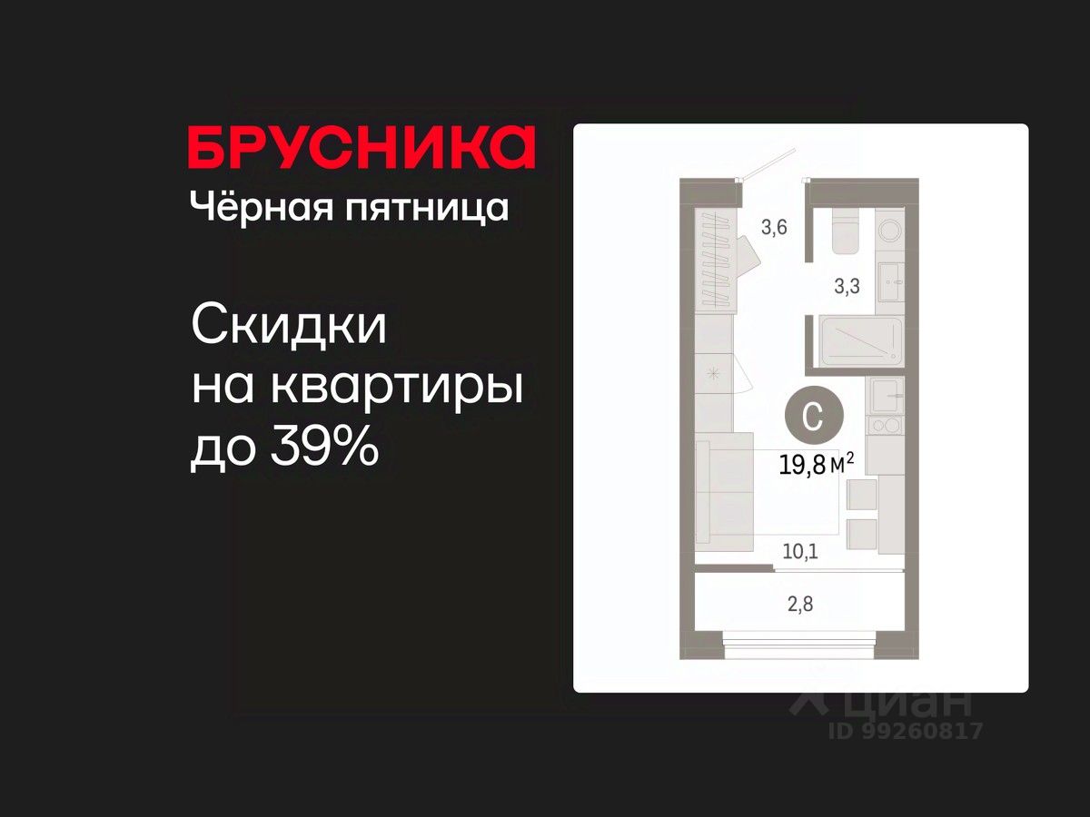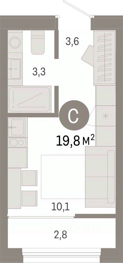 1-комн. студия от застройщика с предчистовой отделкой в ЖК "Республики 205" на 6 этаже. Общая площадь: 19.82 кв.м., площадь гостиной 10.1 кв.м., из которых 5 кв.м. выделено под кухонную зону. Все окна выходят на одну сторону. В квартире один балкон, один совмещенный санузел. Высота потолков 2.6 м.