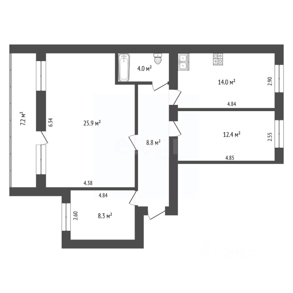 Комнаты: кухня-столовая, две спальни, большая гостиная с выходом на застекленную лоджию, совмещенный санузел, коридор и общий тамбур с соседями