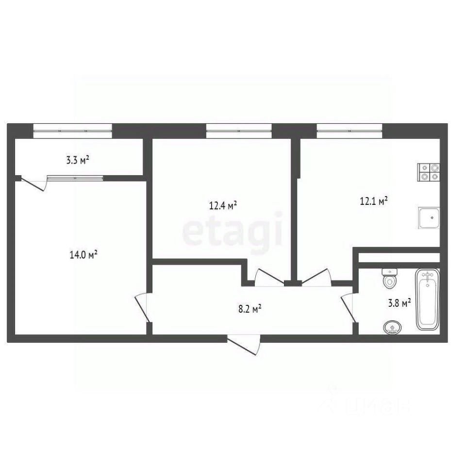 Планирoвка: коридор 8,2 кв.м, просторная кухня-гостиная 14 кв.м, две изолированных комнаты по 12 кв.м., одна из комнат с выходом на лоджию 3,3 кв.м, санузел с современной сантехникой. Большие окна обеспечивают хорошее естественное освещение, а лоджия позволяет расширить полезное пространство.