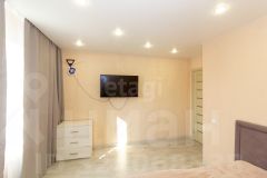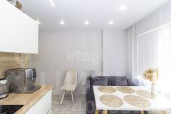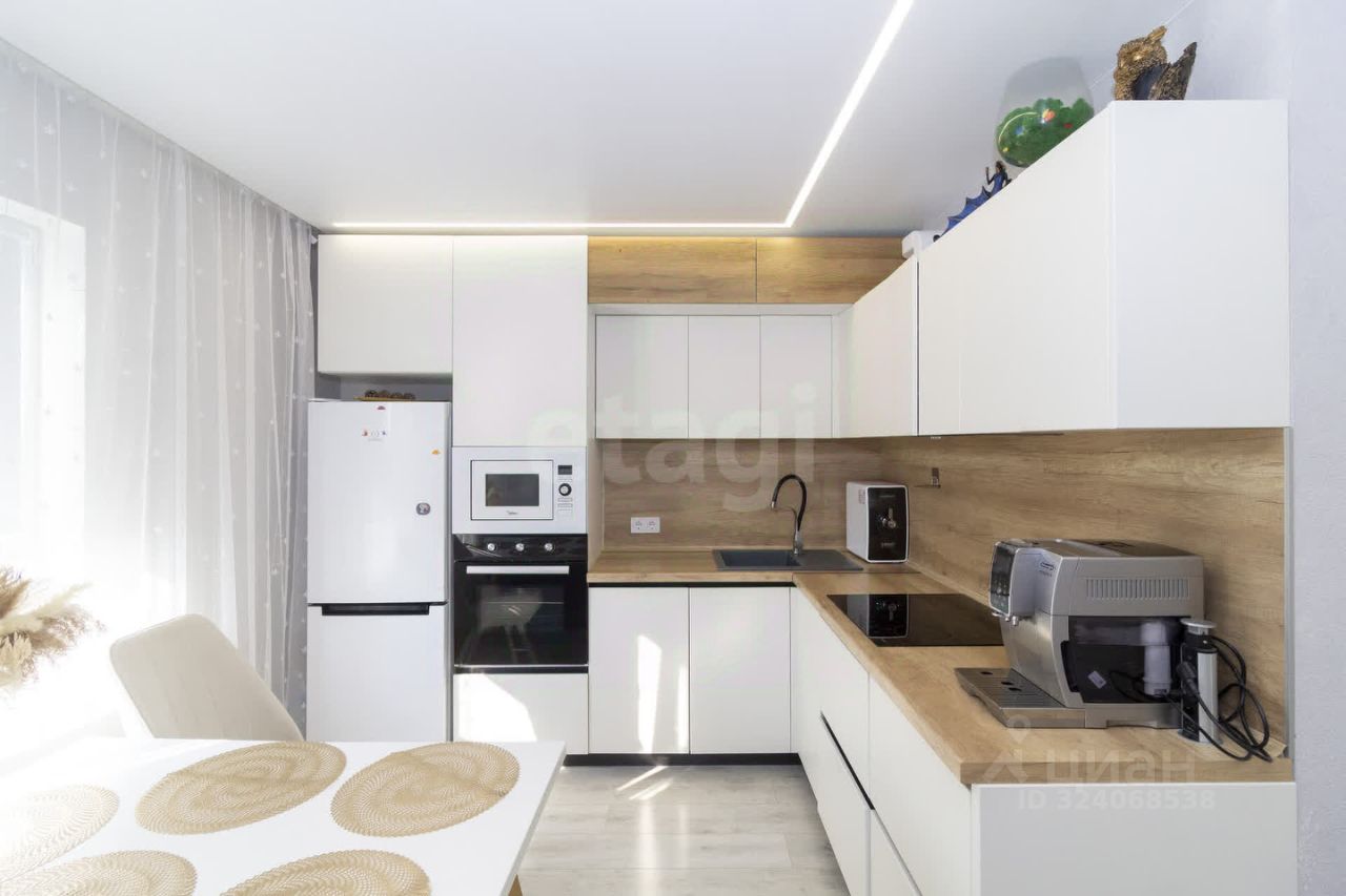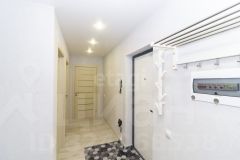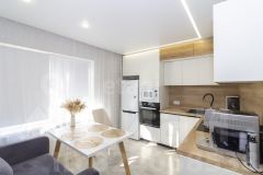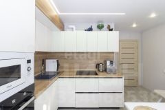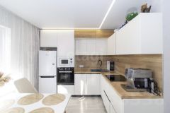 В квартире выполнен качественный ремонт с нейтральной отделкой — светлые стены, ламинат в жилых помещениях. Кухня оборудована встроенной техникой (холодильник, варочная панель, вытяжка), предусмотрены шкафы для хранения.