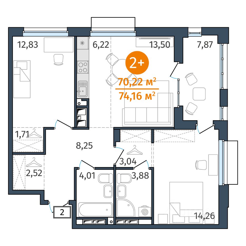Продается 2-комн. квартира, 70,22 м²