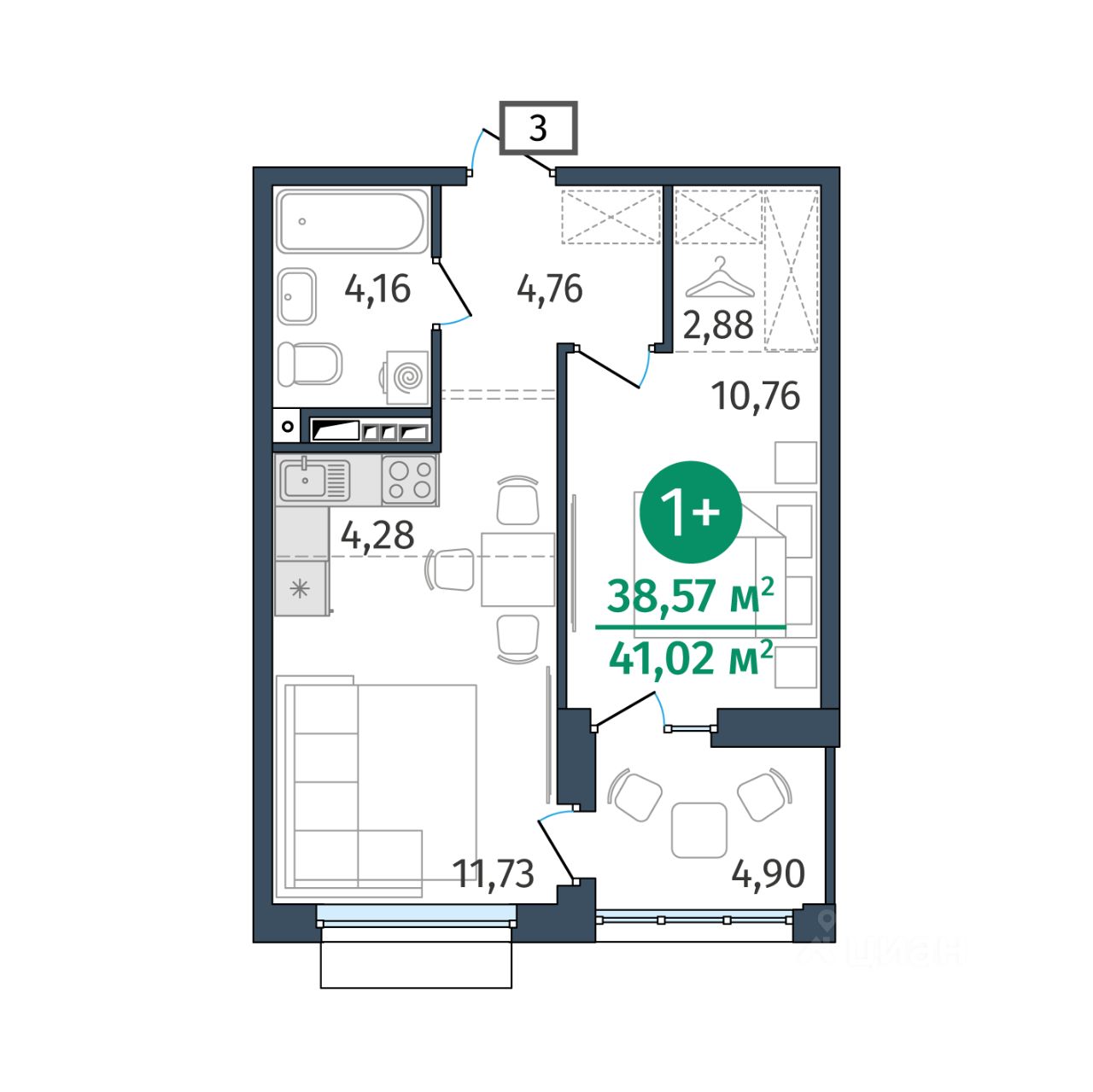 Общая площадь38,57 м²