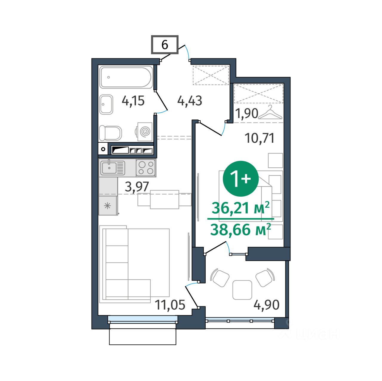 Общая площадь36,21 м²