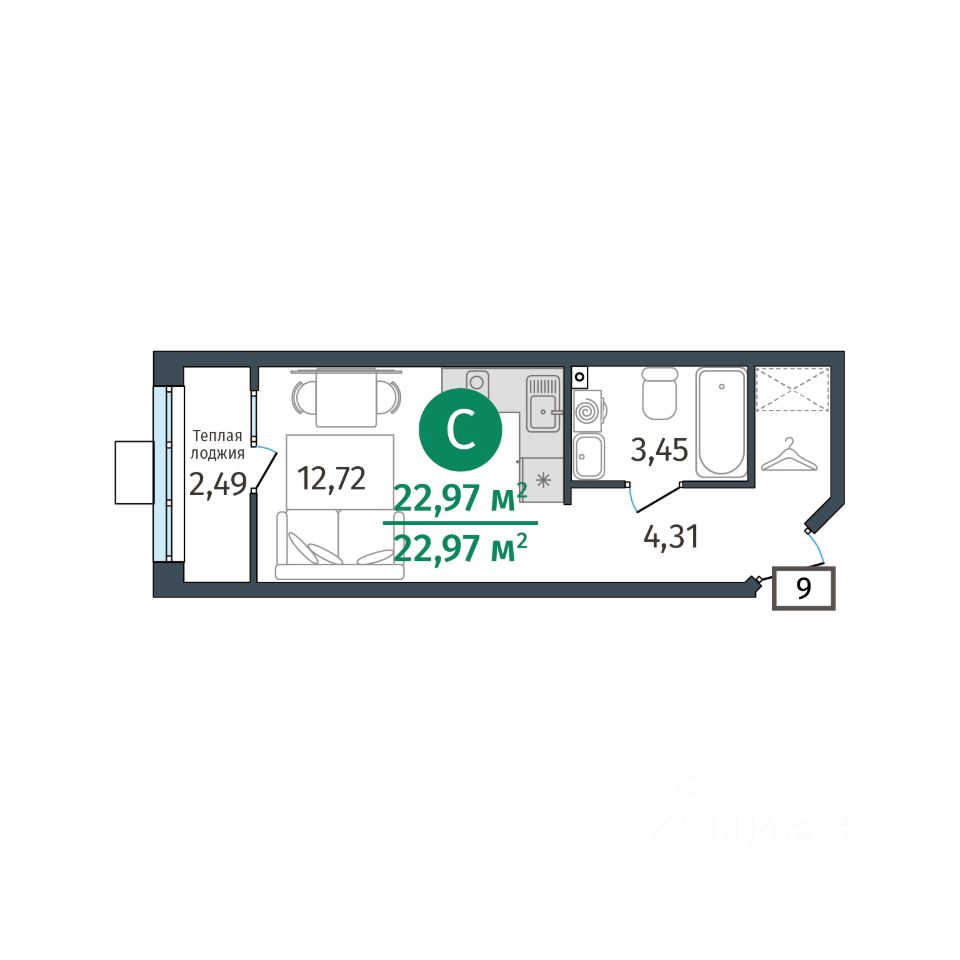 Общая площадь22,97 м²