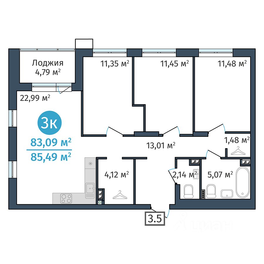 Общая площадь83,09 м²
