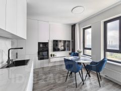 В квартире сохранена почти вся техника: кондиционер, встроенная кухня с посудомоечной машиной, духовым шкафом и электрической панелью.