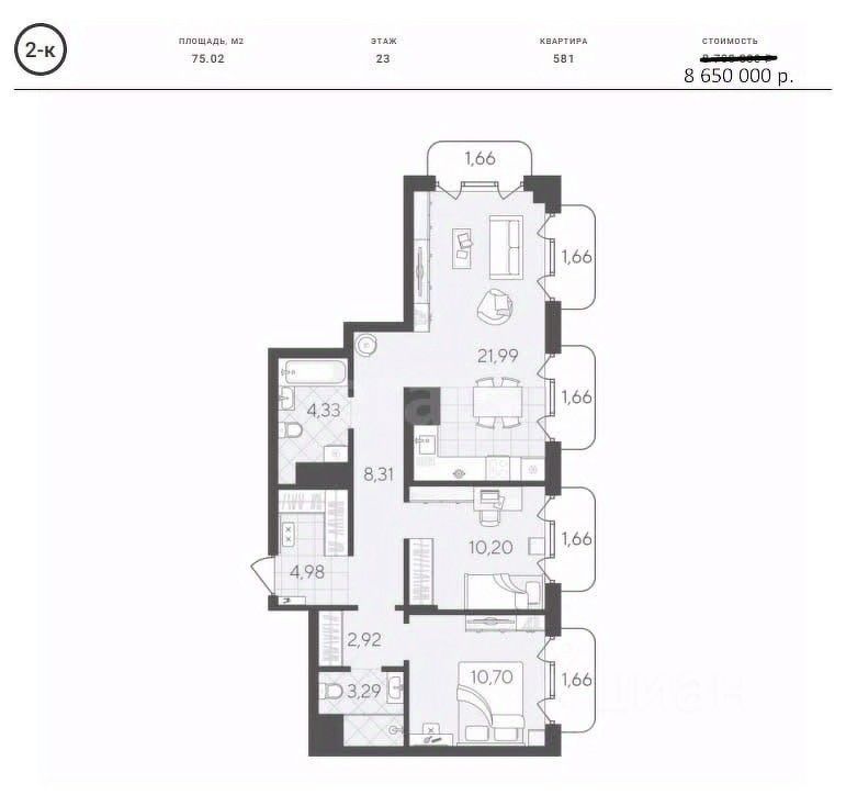 Продается просторная квартира площадью 66,7 кв.м. с двумя полноценными спальнями предлагает комфортное проживание для семьи. Ключевыми преимуществами являются видовые характеристики квартиры с 23 этажа.
