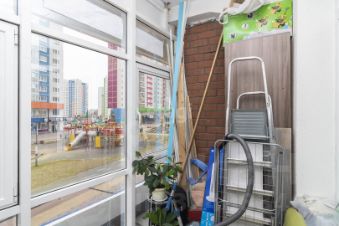 Большой балкон с витражным остеклением утренний кофе с видом на зеленый бульвар