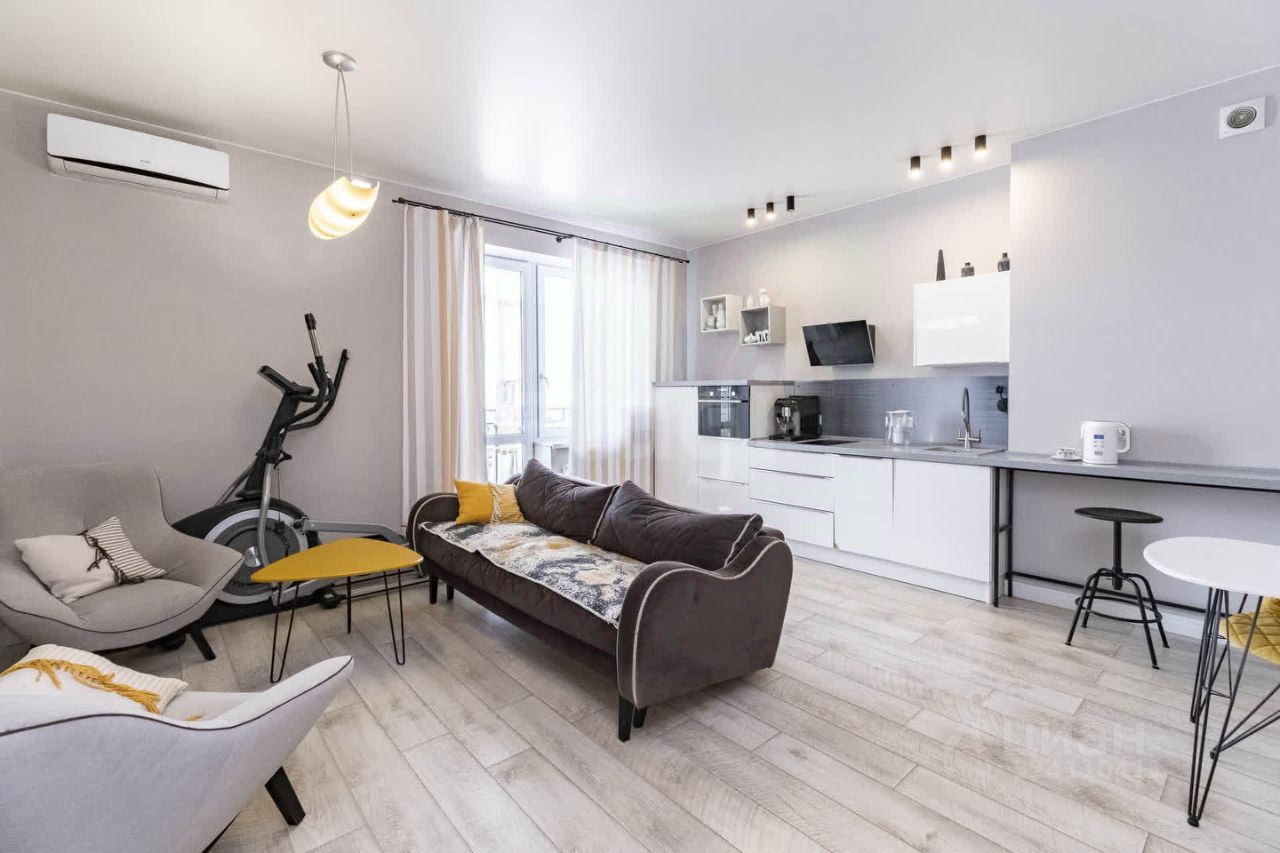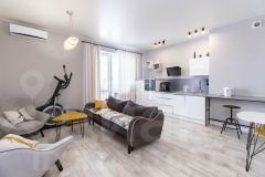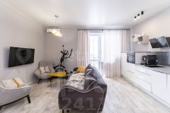 1 кухня-гостиная - кухонный гарнитур со встроенной техникой-холодильник, посудомойка, духовка (с функцией СВЧ), вытяжка, встроенный фильтр для воды, кондиционер, диван, шторы, часы настенные