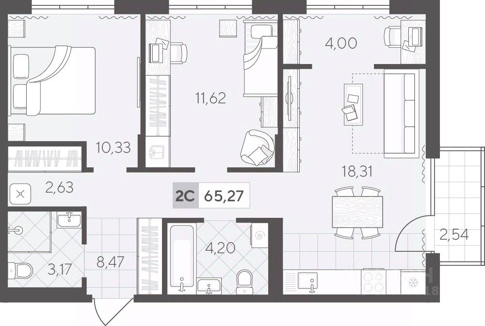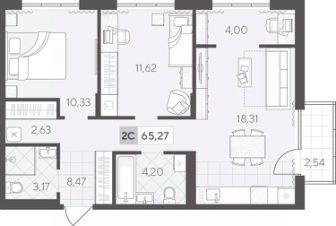 Квартира с двумя спальнями площадью 65.27 кв.м на 2 этаже. Продуманная геометрия комнат позволит легко зонировать пространство для личного досуга и места, где удобно проводить время с семьей или встречать гостей.