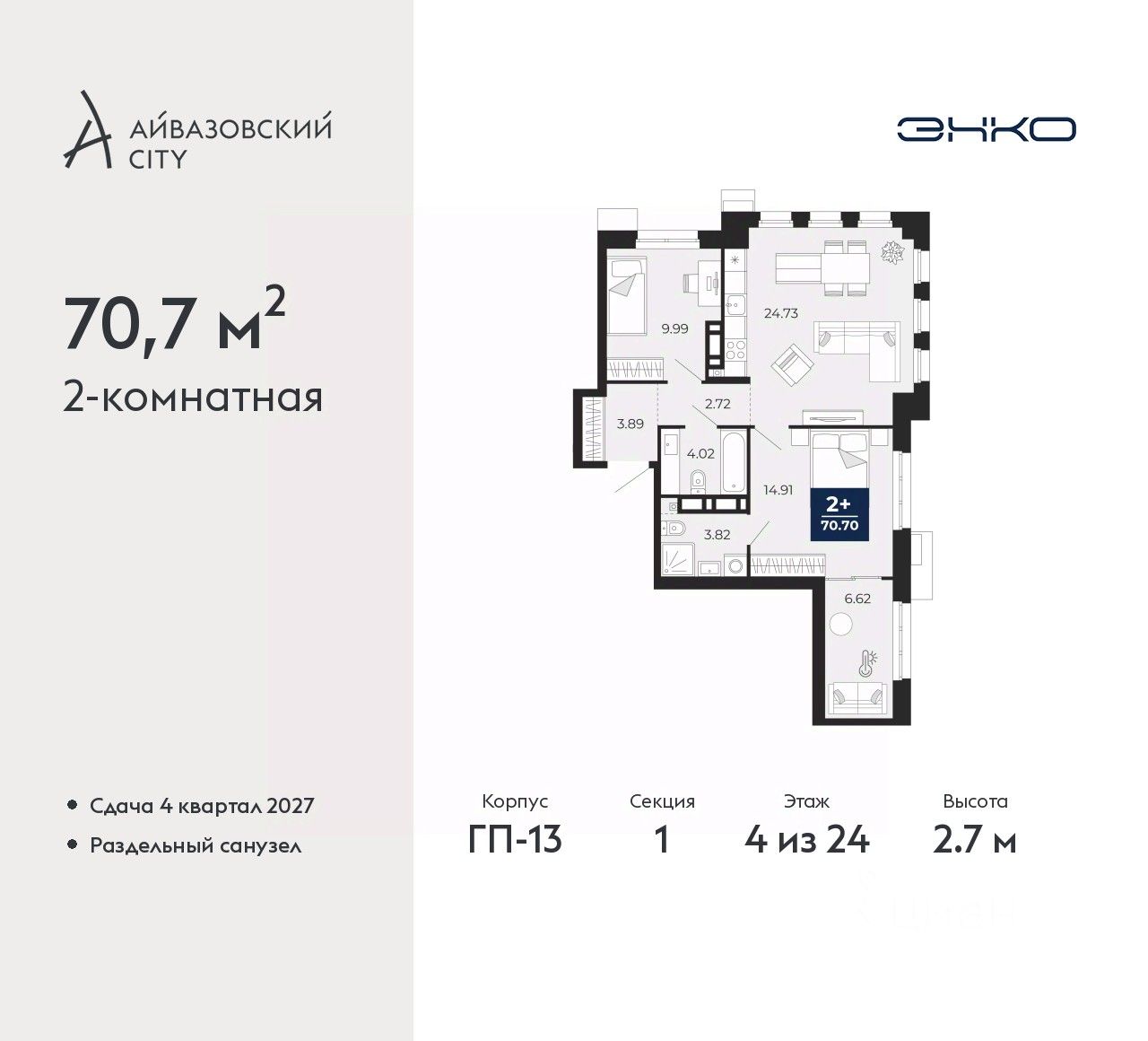 2-комн. квартира в ЖК "Айвазовский City" на 4 этаже. Общая площадь: 70.7 кв.м. Высота потолков 2.7 м.