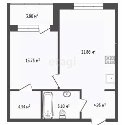Вас ждет уникальная планировка, которая сочетает в себе комфорт и функциональность. Просторная кухня-гостиная площадью 21.8 кв.м. с двумя окнами станет центром вашего домашнего уюта, а спальня площадью 13.75 кв.м. обеспечит вам комфортный отдых. Также предусмотрена практичная прихожая и совмещенный санузел площадью 5,1 кв.м.