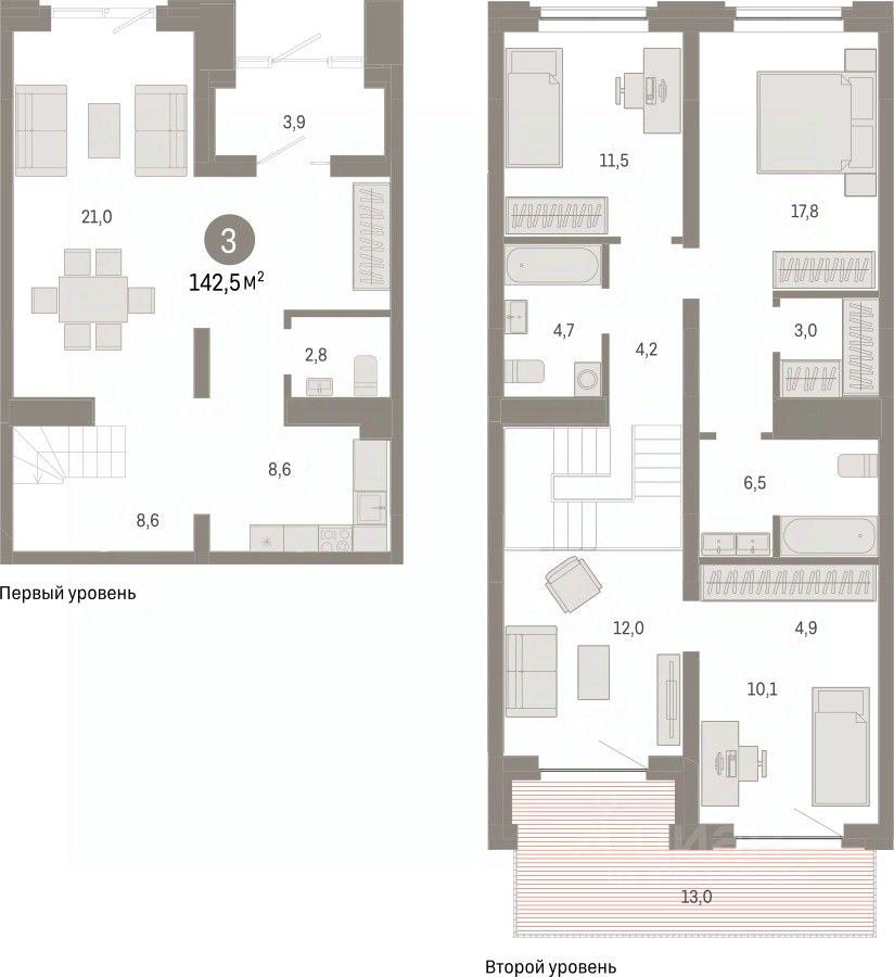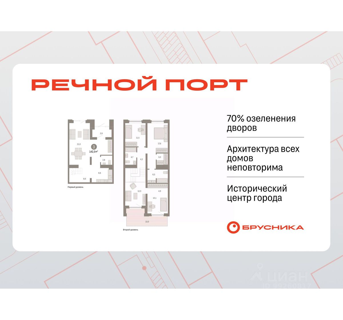 Двухуровневая квартира с кухней-гостиной и тремя спальнями в жилом районе "Речной порт". Особенности планировки: гардеробная, окна в пол, без отделки, двухуровневая, вид во двор, отдельный вход, свободная планировка, второй свет, мастер-спальня, терраса на крыше.