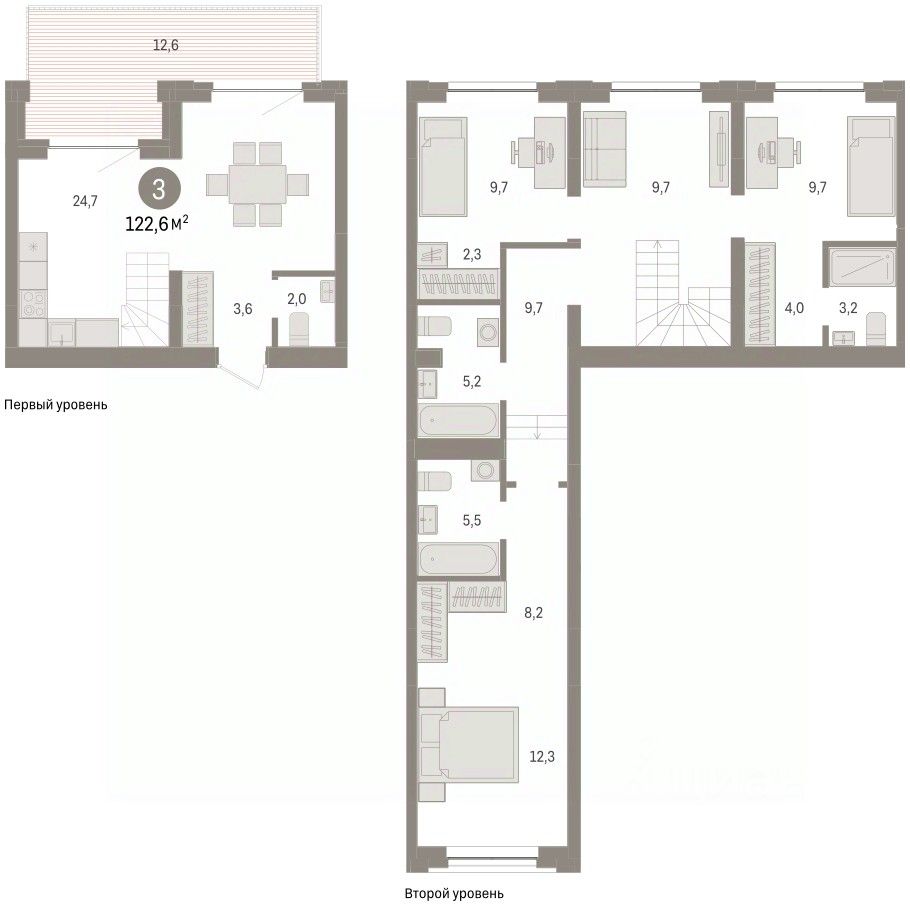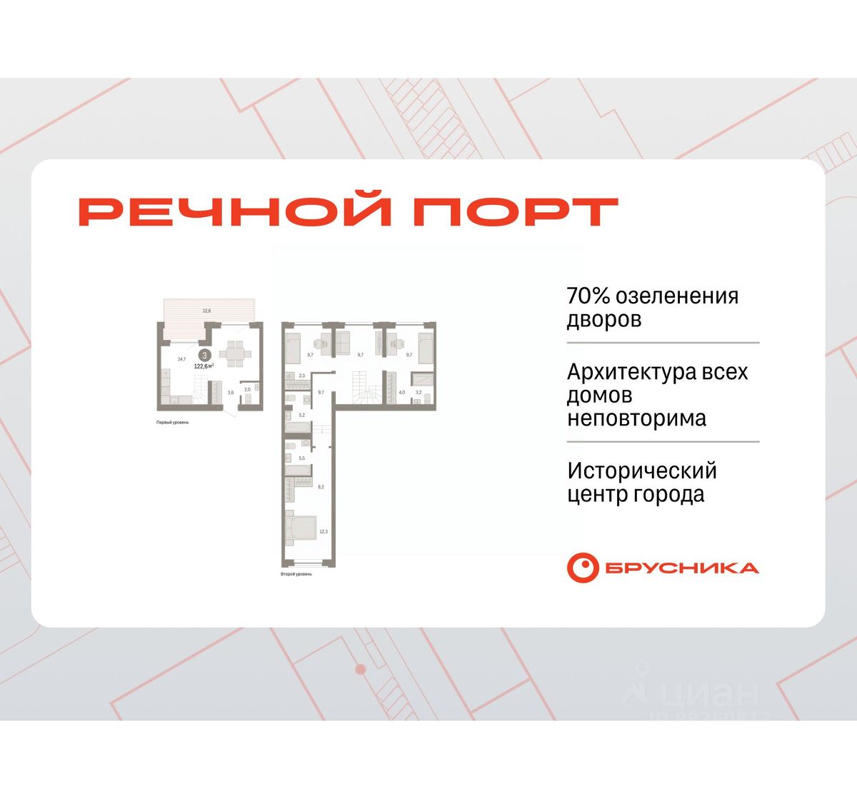 Двухуровневая квартира с кухней-гостиной и тремя спальнями в жилом районе "Речной порт". Особенности планировки: без отделки, двухуровневая, вид во двор, свободная планировка, второй свет, терраса на крыше.
