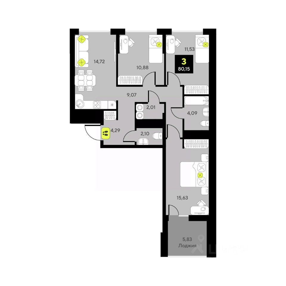 Продаётся 3-комнатная квартира в строящемся доме (ГП-6), срок сдачи: II-кв. 2026, общей площадью 80.15 кв.м., на 2 этаже. Новый жилой комплекс "Мотивы" от компании "ISB Development" расположен в Калининском округе Тюмени на ул. Первооткрывателей.