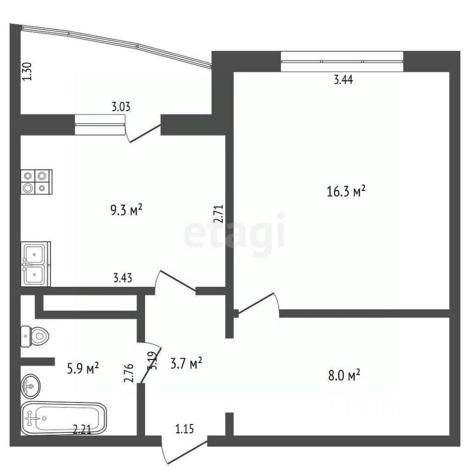 Квартира состоит из уютной кухни (9.3 кв.м).