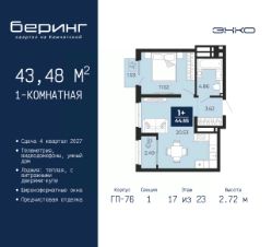 Продается однокомнатная квартира с предчистовой отделкой в ЖК "Беринг" на 17 этаже. Общая площадь: 43.48 кв.м., жилая: 11.52 кв.м., площадь просторной кухни-столовой: 20.53 кв.м. Все окна выходят на одну сторону. В квартире один балкон и одна лоджия, один совмещенный санузел. Высота потолков 2.72 м.