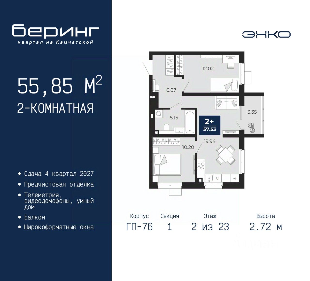 Двухкомнатная квартира с предчистовой отделкой в ЖК "Беринг" на 2 этаже. Общая площадь: 55.85 кв.м., жилая: 22.22 кв.м., площадь просторной кухни-столовой: 19.94 кв.м. Квартира угловая, идеально подойдет любителям тишины и панорамных видов. В квартире один балкон, один совмещенный санузел. Высота потолков 2.72 м.