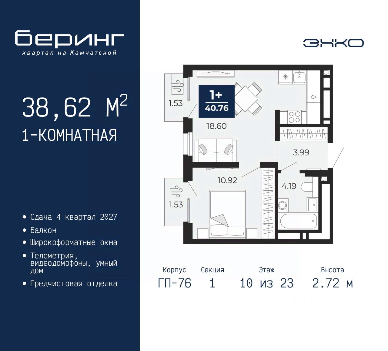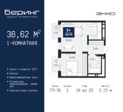 1-комн. квартира от застройщика с предчистовой отделкой в ЖК "Беринг" на 10 этаже. Общая площадь: 38.62 кв.м., жилая: 10.92 кв.м., площадь просторной кухни-столовой: 18.6 кв.м. Все окна выходят на одну сторону. В квартире два балкона, один совмещенный санузел. Высота потолков 2.72 м.