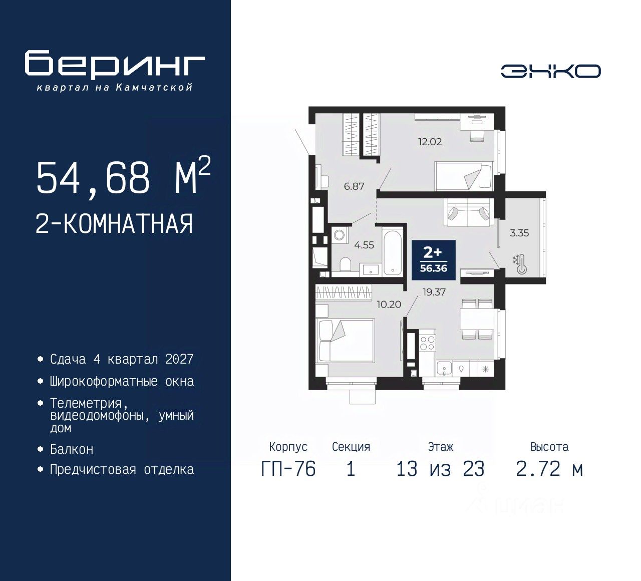 2-комн. квартира от застройщика с предчистовой отделкой в ЖК "Беринг" на 13 этаже. Общая площадь: 54.68 кв.м., жилая: 22.22 кв.м., площадь просторной кухни-столовой: 19.37 кв.м. Угловая квартира, идеально подойдет любителям тишины и панорамных видов. В квартире один балкон, один совмещенный санузел. Высота потолков 2.72 м.