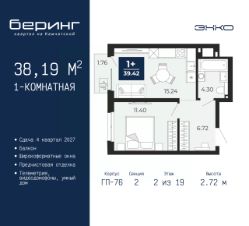 Просторная 1-комн. квартира с предчистовой отделкой в ЖК "Беринг" на 2 этаже. Общая площадь: 38.19 кв.м., жилая: 11.4 кв.м., площадь просторной кухни-столовой: 15.24 кв.м. Все окна выходят на одну сторону. В квартире один балкон, один совмещенный санузел. Высота потолков 2.72 м.