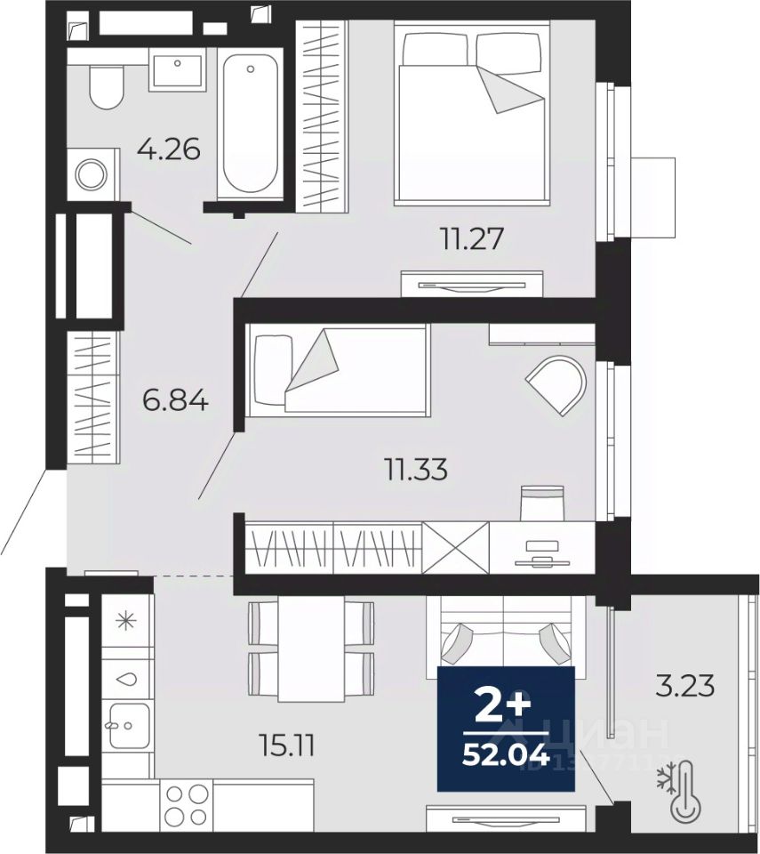 2-комн. квартира с предчистовой отделкой в ЖК "Беринг" на 2 этаже. Общая площадь: 50.42 кв.м., жилая: 22.6 кв.м., площадь просторной кухни-столовой: 15.11 кв.м. Комнаты изолированные, все окна выходят на одну сторону. В квартире один балкон, один совмещенный санузел. Высота потолков 2.72 м.