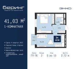 1-комн. квартира от застройщика с предчистовой отделкой в ЖК "Беринг" на 5 этаже. Общая площадь: 41.03 кв.м., жилая: 14.72 кв.м., площадь просторной кухни-столовой: 16.59 кв.м. Все окна выходят на одну сторону. В квартире один балкон, один совмещенный санузел. Высота потолков 2.72 м.