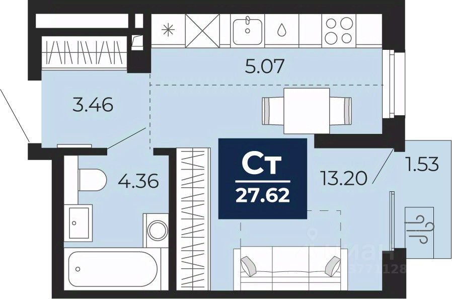 1-комн. квартира-студия с предчистовой отделкой в ЖК "Беринг" на 5 этаже. Общая площадь: 26.55 кв.м., площадь гостиной 18.27 кв.м., из которых 5.07 кв.м. выделено под кухонную зону. Все окна выходят на одну сторону. В квартире один балкон, один совмещенный санузел. Высота потолков 2.72 м.