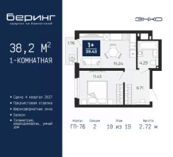 Продается 1-комн. квартира с предчистовой отделкой в ЖК "Беринг" на 10 этаже. Общая площадь: 38.2 кв.м., жилая: 11.43 кв.м., площадь просторной кухни-столовой: 15.24 кв.м. Все окна выходят на одну сторону. В квартире один балкон, один совмещенный санузел. Высота потолков 2.72 м.
