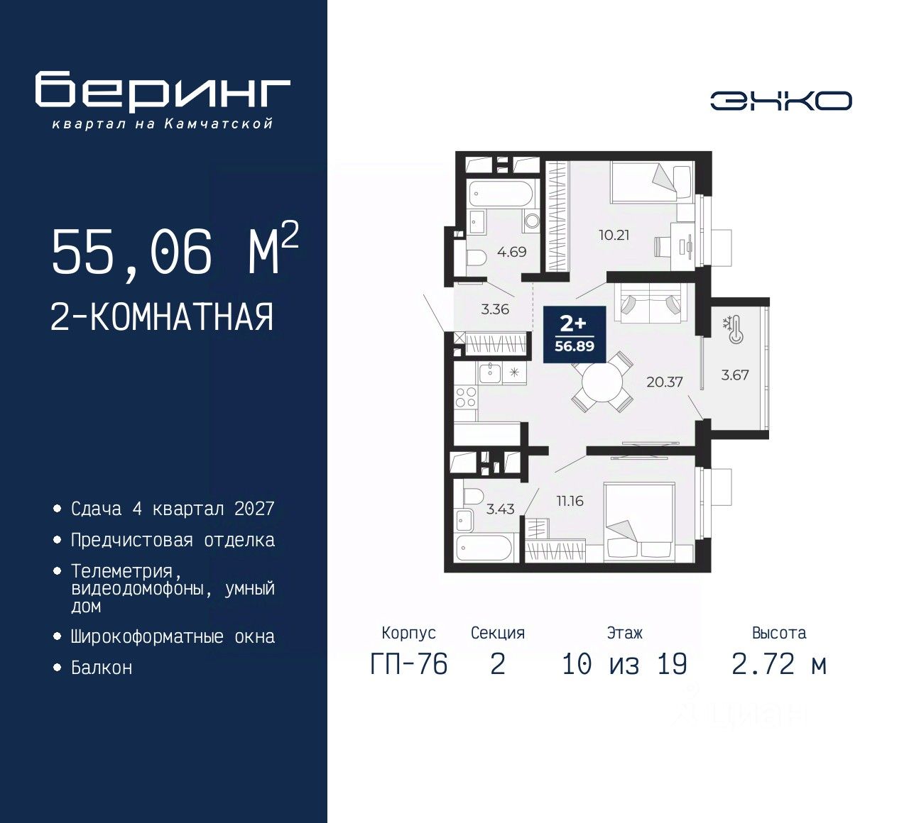 2-комн. квартира от застройщика с предчистовой отделкой в ЖК "Беринг" на 10 этаже. Общая площадь: 55.06 кв.м., жилая: 21.37 кв.м., площадь просторной кухни-столовой: 20.37 кв.м. Комнаты изолированные, все окна выходят на одну сторону. В квартире один балкон, два совмещенных санузла. Высота потолков 2.72 м.