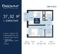Продается 1-комн. квартира от застройщика с предчистовой отделкой в ЖК "Беринг" на 13 этаже. Общая площадь: 37.92 кв.м., жилая: 12.07 кв.м., площадь просторной кухни-столовой: 13.68 кв.м. Все окна выходят на одну сторону. В квартире один балкон, один совмещенный санузел. Высота потолков 2.72 м.