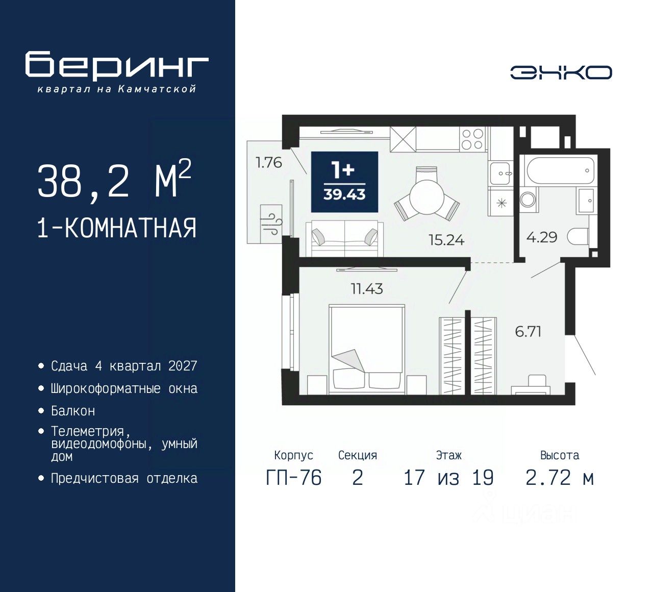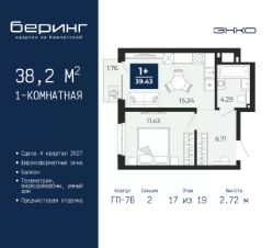 1-комн. квартира от застройщика с предчистовой отделкой в ЖК "Беринг" на 17 этаже. Общая площадь: 38.2 кв.м., жилая: 11.43 кв.м., площадь просторной кухни-столовой: 15.24 кв.м. Все окна выходят на одну сторону. В квартире один балкон, один совмещенный санузел. Высота потолков 2.72 м.