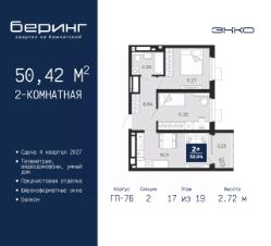 2-комн. квартира с предчистовой отделкой в ЖК "Беринг" на 17 этаже. Общая площадь: 50.42 кв.м., жилая: 22.6 кв.м., площадь просторной кухни-столовой: 15.11 кв.м. Комнаты изолированные, все окна выходят на одну сторону. В квартире один балкон, один совмещенный санузел. Высота потолков 2.72 м.