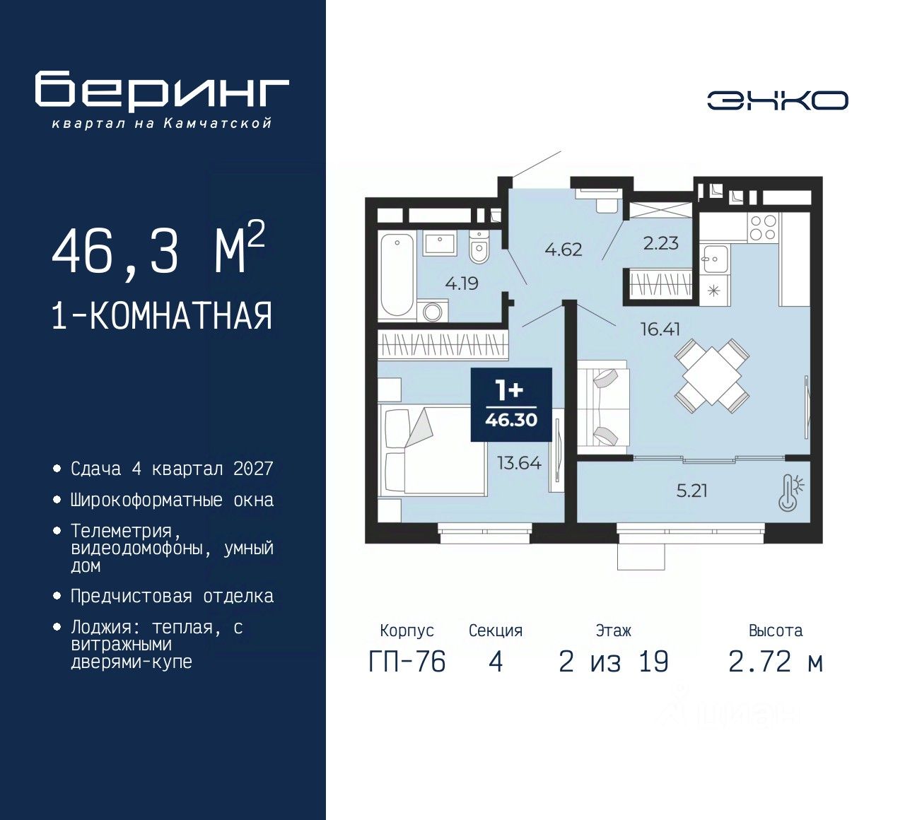Однокомнатная квартира от застройщика с предчистовой отделкой в ЖК "Беринг" на 2 этаже. Общая площадь: 46.3 кв.м., жилая: 13.64 кв.м., площадь просторной кухни-столовой: 16.41 кв.м. Все окна выходят на одну сторону. В квартире одна лоджия, один совмещенный санузел. Высота потолков 2.72 м.