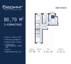 Продается трехкомнатная квартира от застройщика с предчистовой отделкой в ЖК "Беринг" на 5 этаже. Общая площадь: 80.79 кв.м., жилая: 38.59 кв.м., площадь просторной кухни-столовой: 19.7 кв.м. Квартира - распашонка, без проходных комнат, окна выходят на paзные стороны дома. В квартире один балкон, два совмещенных санузла. Высота потолков 2.72 м.