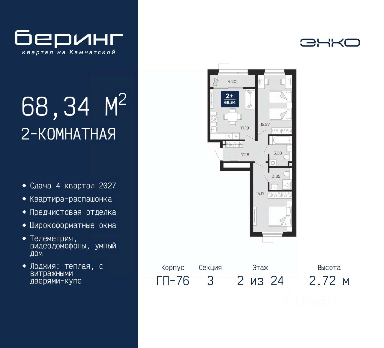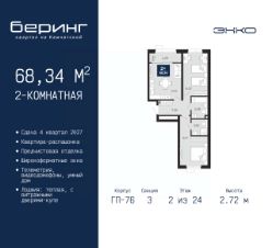 2-комн. квартира с предчистовой отделкой в ЖК "Беринг" на 2 этаже. Общая площадь: 68.34 кв.м., жилая: 30.74 кв.м., площадь просторной кухни-столовой: 17.19 кв.м. Квартира - распашонка, без проходных комнат, окна выходят на paзные стороны дома. В квартире одна лоджия, два совмещенных санузла. Высота потолков 2.72 м.