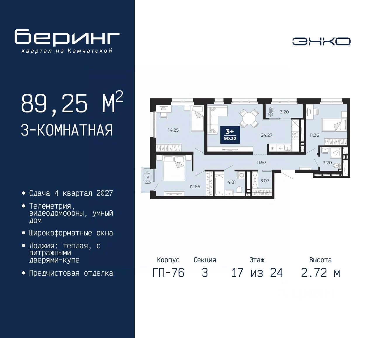 3-комн. квартира от застройщика с предчистовой отделкой в ЖК "Беринг" на 17 этаже. Общая площадь: 89.25 кв.м., жилая: 38.27 кв.м., площадь просторной кухни-столовой: 24.27 кв.м. Квартира угловая, очень светлая, естественная вентиляция при открытии окон. В квартире один балкон и одна лоджия, два совмещенных санузла. Высота потолков 2.72 м.