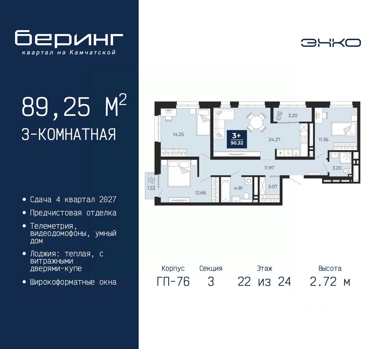 Продается трехкомнатная квартира от застройщика с предчистовой отделкой в ЖК "Беринг" на 22 этаже. Общая площадь: 89.25 кв.м., жилая: 38.27 кв.м., площадь просторной кухни-столовой: 24.27 кв.м. Квартира угловая, очень светлая, естественная вентиляция при открытии окон. В квартире один балкон и одна лоджия, два совмещенных санузла. Высота потолков 2.72 м.